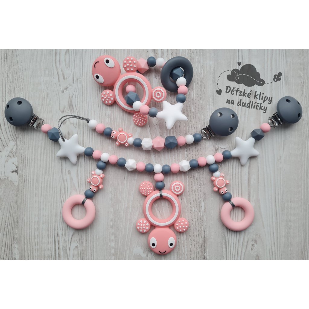 Sada obsahuje klip na dudlík, kulaté kousátko i závěs na kočárek.