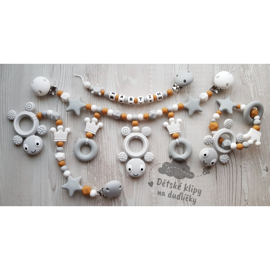 Sada obsahuje klip na dudlík, kulaté i závěsné kousátko, závěs na kočárek.