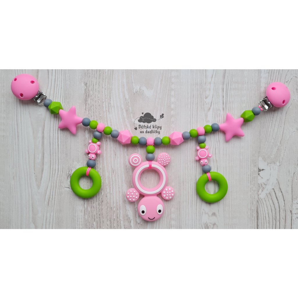 Závěs na kočárek růžová želvička se zelenými kroužky