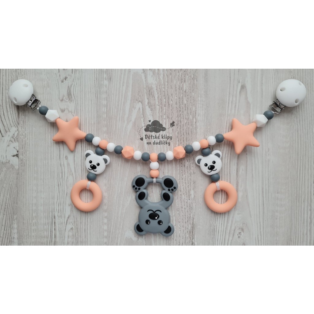 Závěs na kočárek šedý medvídek a broskvové kroužky