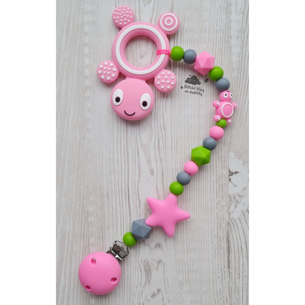 Závěsné kousátko růžová želvička v kombinaci šedé a zelené